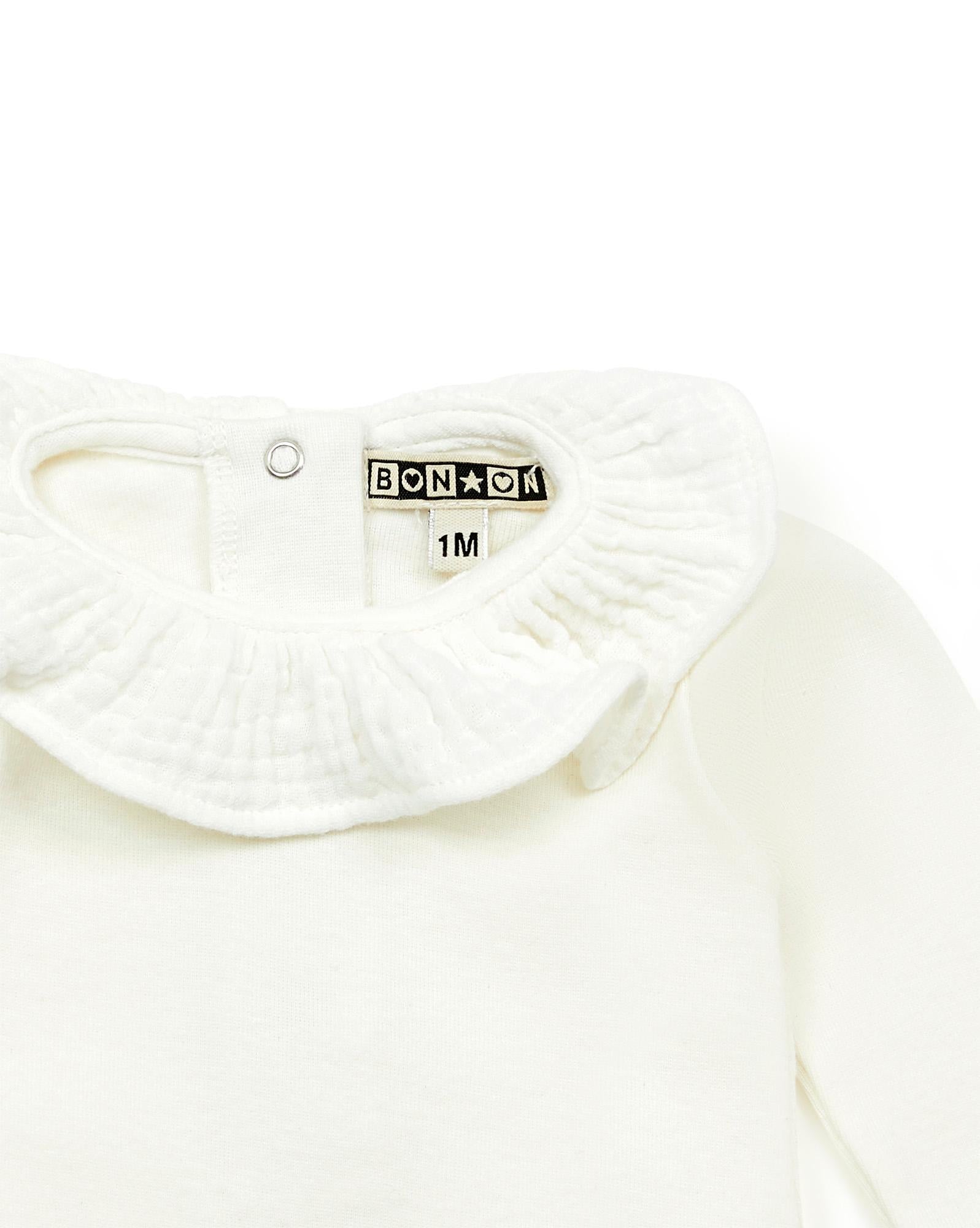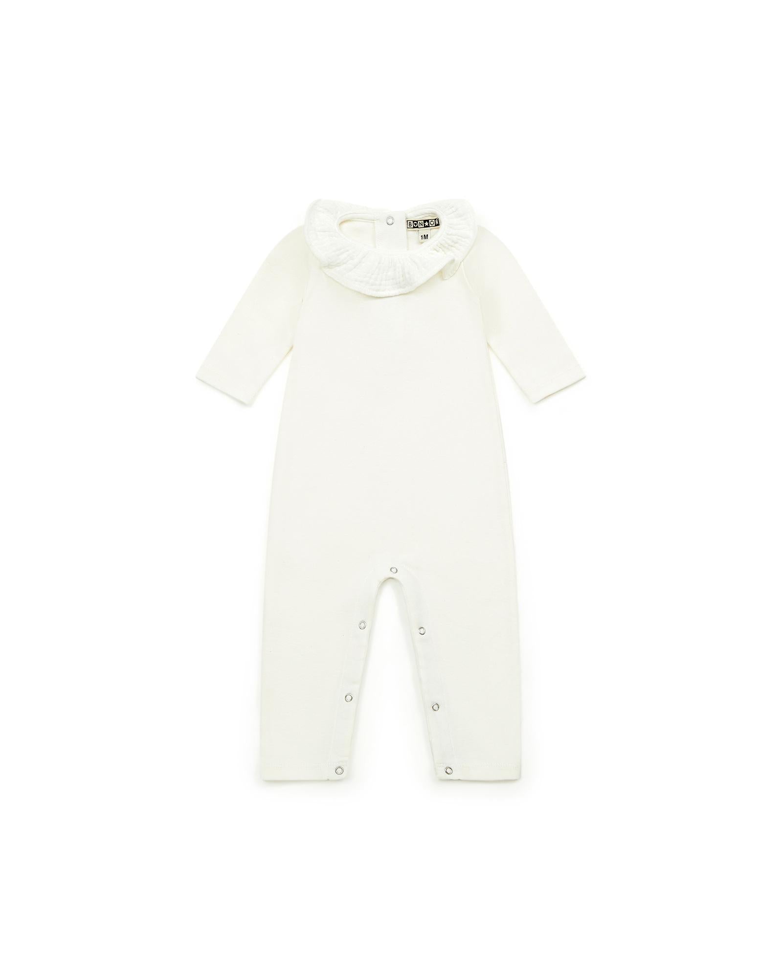 There Jumpsuit is in organic cotton jersey. We like her cream color, her pretty Collar And her sleeves and long legs to be hot.