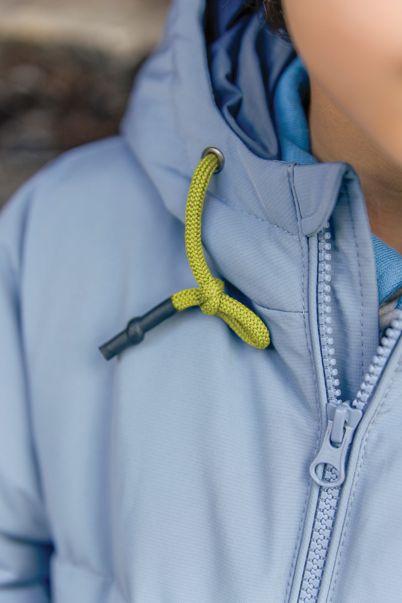 - Hood and zipped closure.