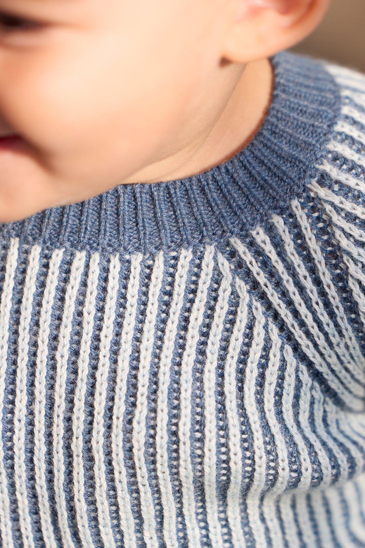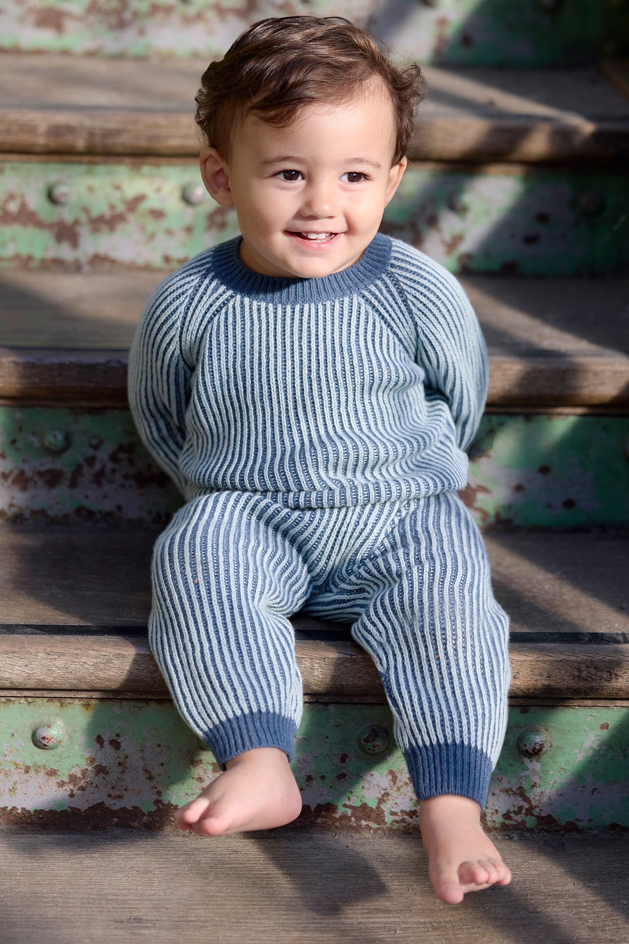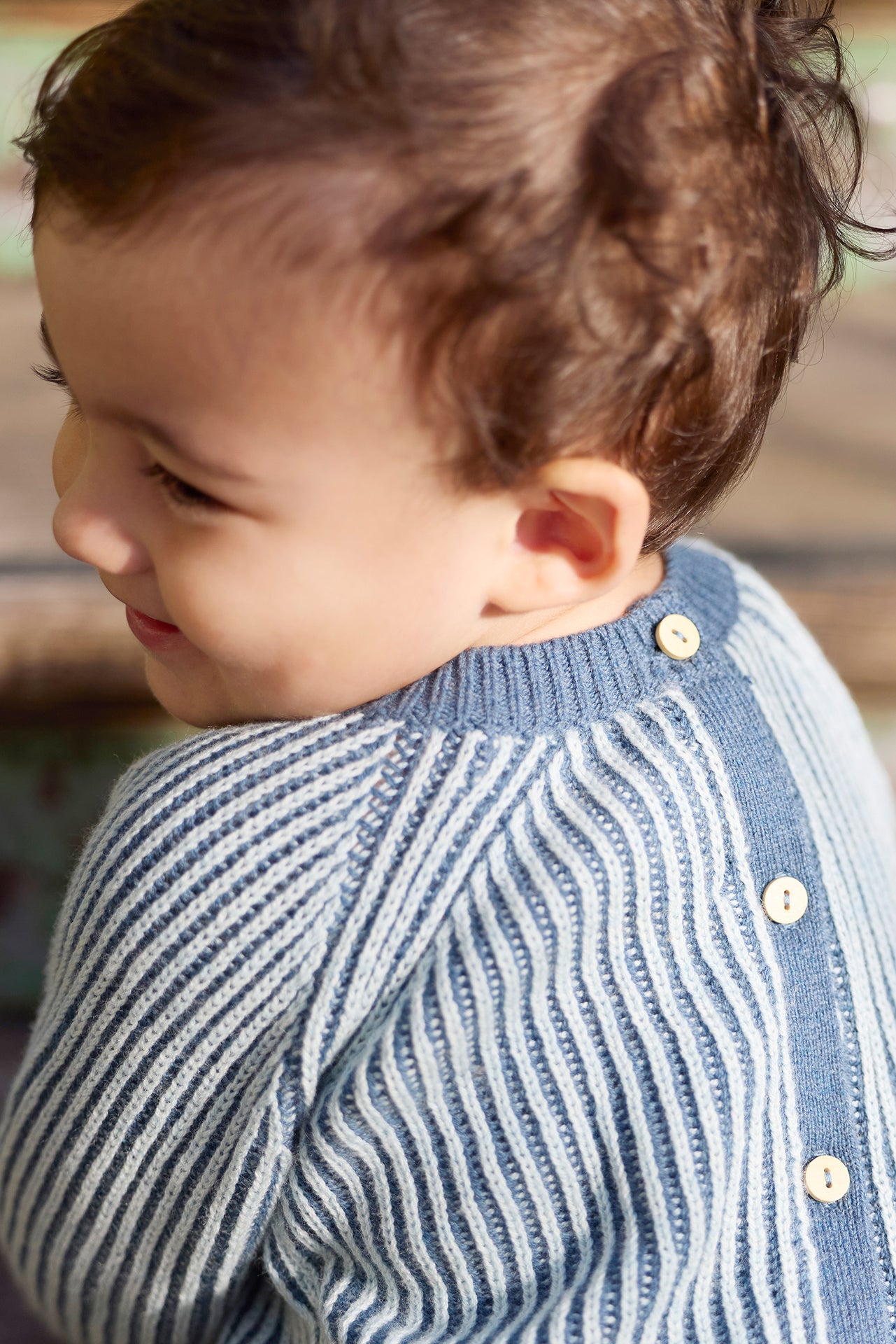 L'Outfit James is available in Peach Whip or Aqua Pale, offering a choice of soft colors for newborns. Made in knitting with contrasting ribs and vertical stripes, this Outfit combines comfort and style for the first days of Baby. Perfect for keeping your little treasure warm and elegant this fall-winter.
