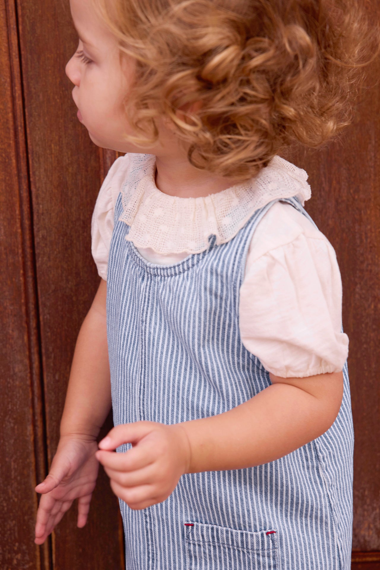 La robe Nolita Denim, avec ses rayures joyeuses et ses surpiqûres rouges, est un clin d'œil à l'été ! Avec ses poches pratiques et sa coupe chasuble, elle invite à la danse et aux jeux. Inspirée du thème "Summer 81", elle apporte une touche vintage et rétro au dressing de votre enfant. Idéale pour flâner au soleil avec un t-shirt léger en dessous.