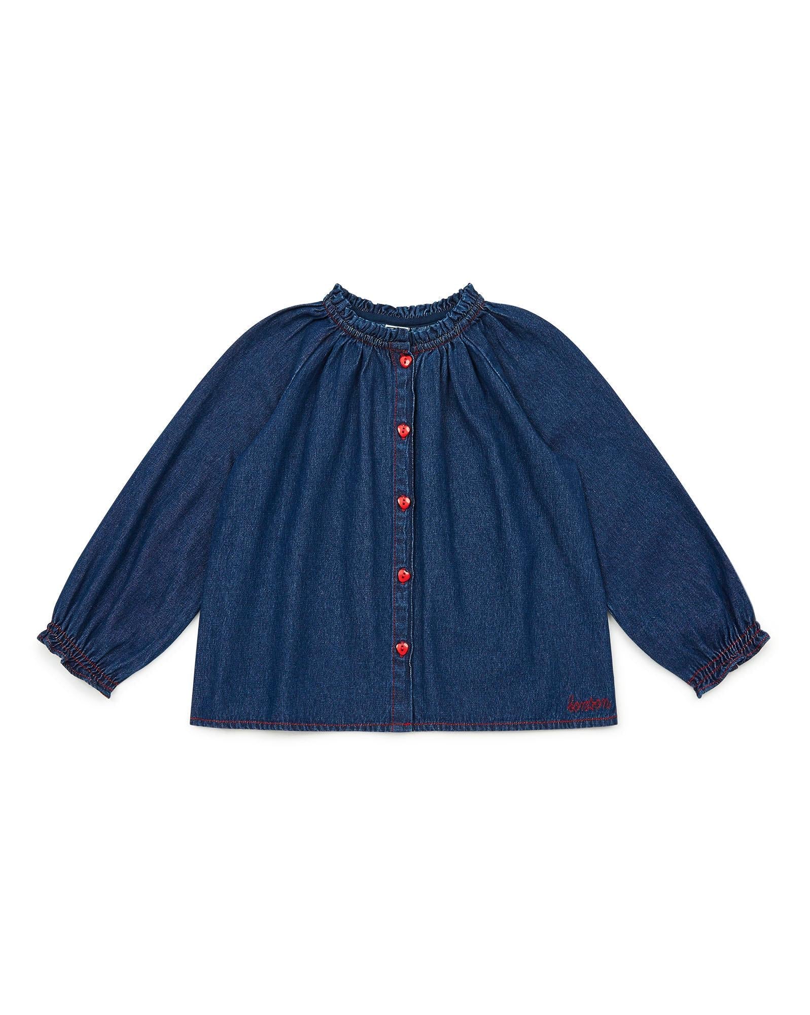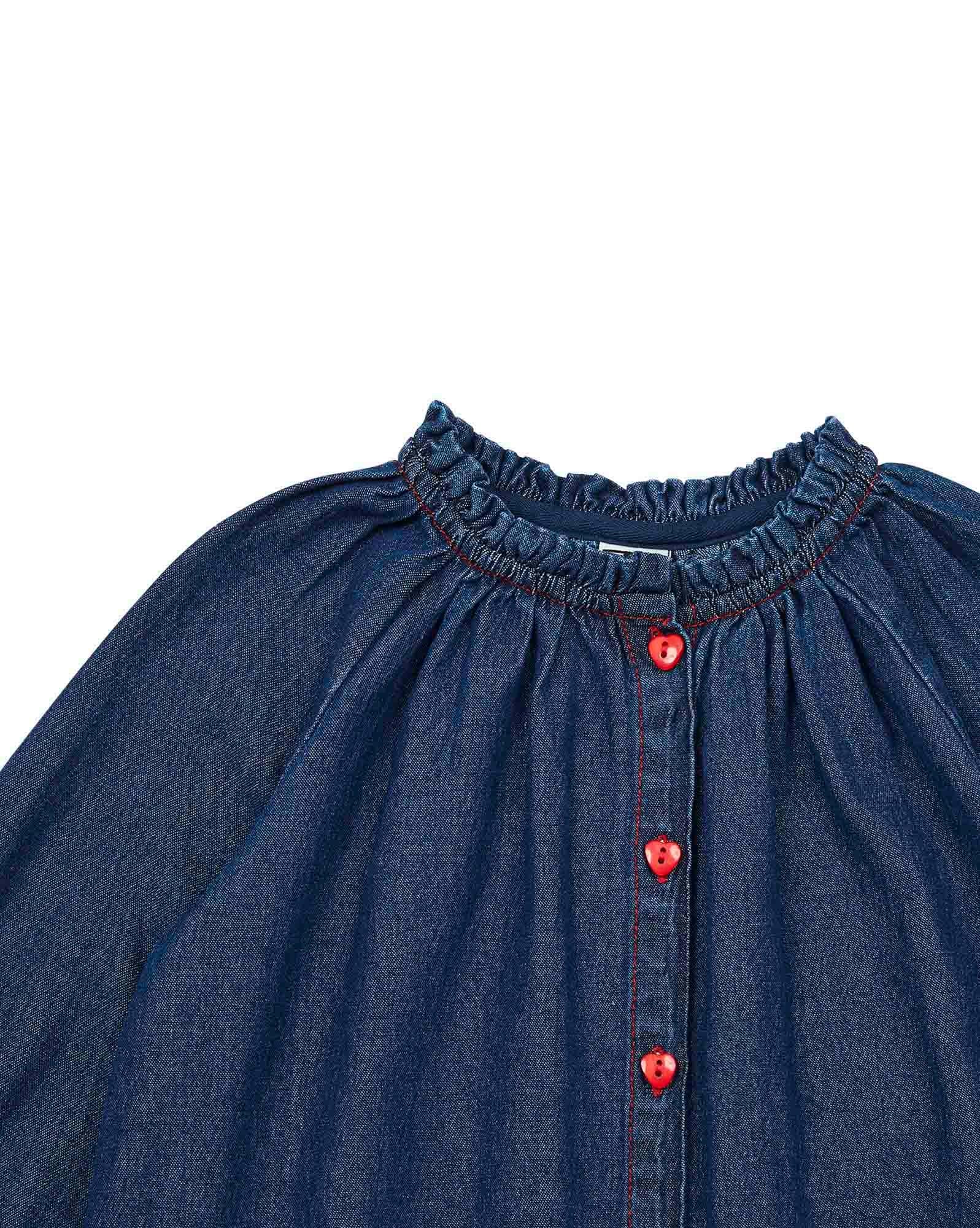 Avec son petit col rond, on craque pour la blouse REINETTE en denim brut de coton. Toute mignonnette, on aime ses manches bouffantes élastiques, son boutonnage coeur sur toute la longueur et ses plissés cousus. Son petit plus ? Les détails de ses surpiqûres et broderies rouge flamboyantes ! Vous pouvez même l'assortir avec la jupe DELIE pour un total look denim.