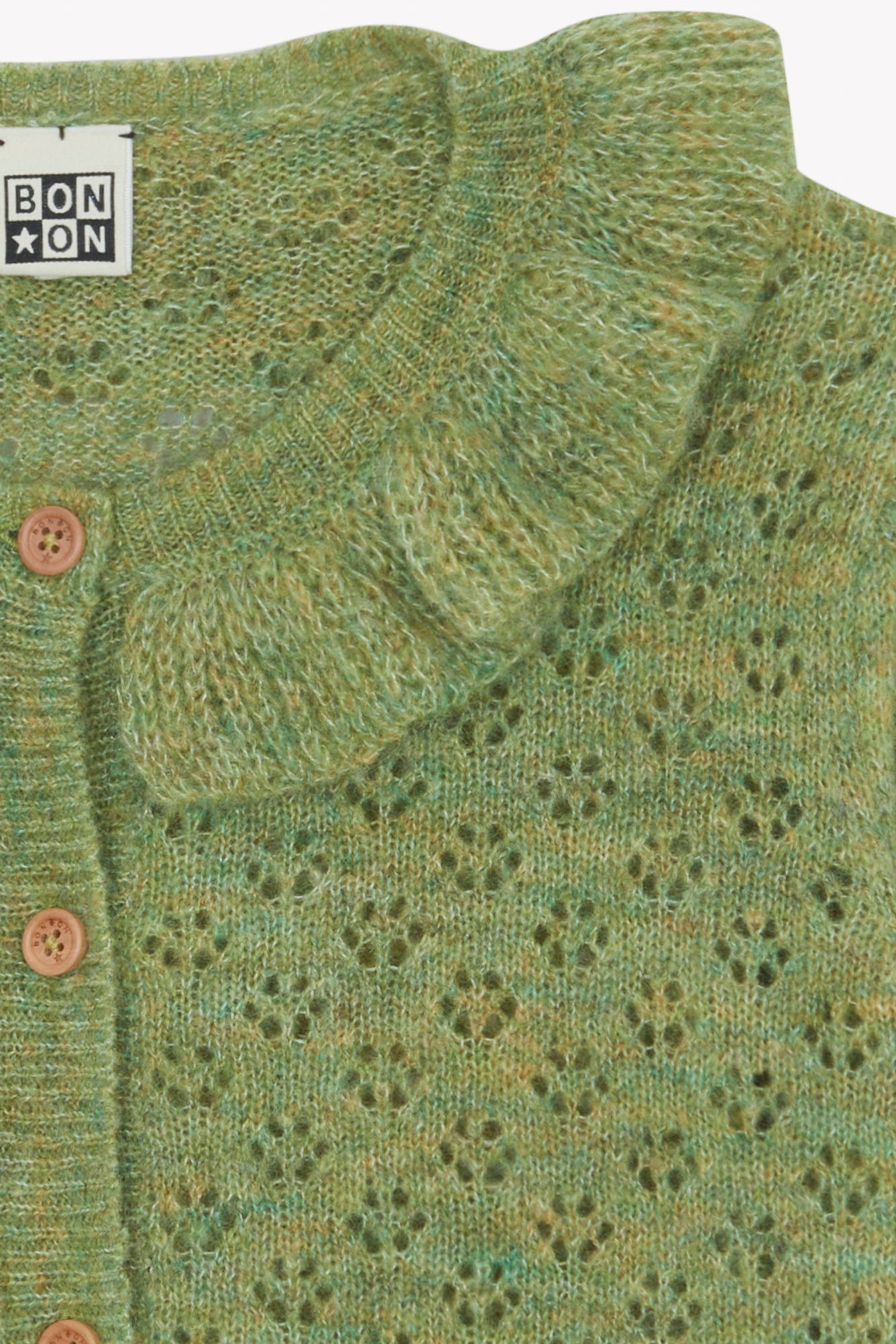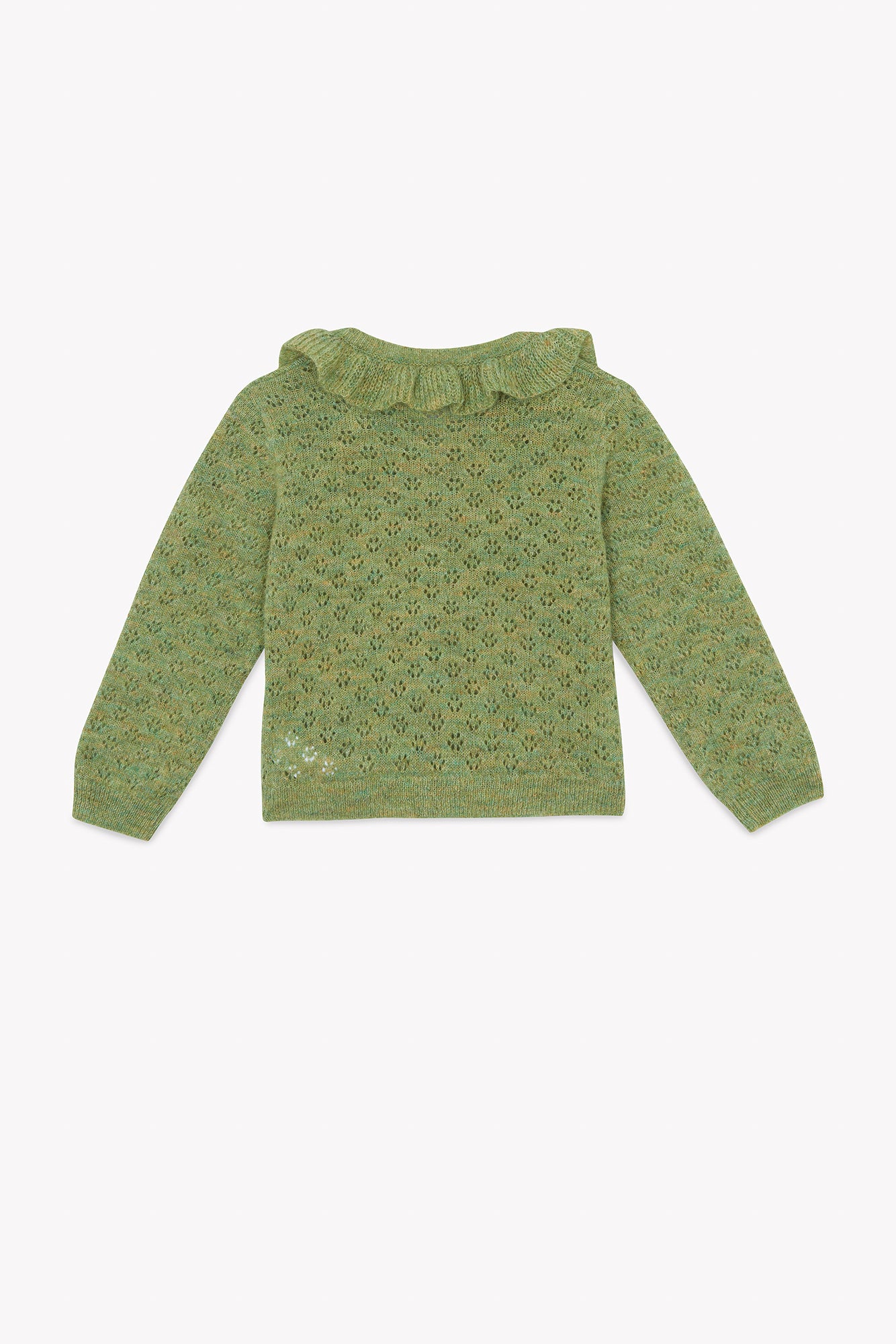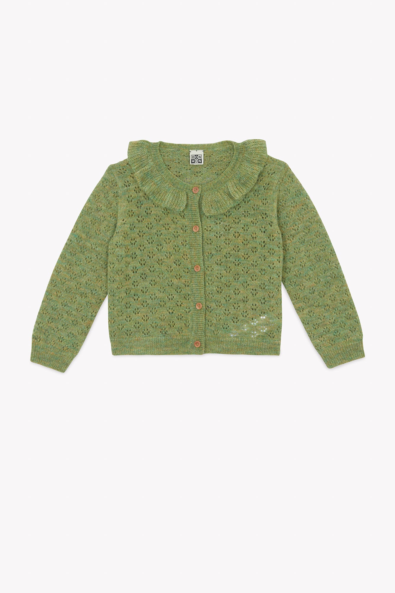Laissez-vous séduire par le cardigan Corolle de la collection Faroe Island, en vert prairie. Avec sa maille ajourée de cœurs et son col volanté, il invite à l'aventure avec un brin de romantisme. Parfait pour une promenade hivernale, il enveloppe votre enfant de douceur et de chaleur. À porter avec un jean ou une jupe pour un look chic et confortable, idéal pour explorer les paysages enchanteurs des îles Féroé !