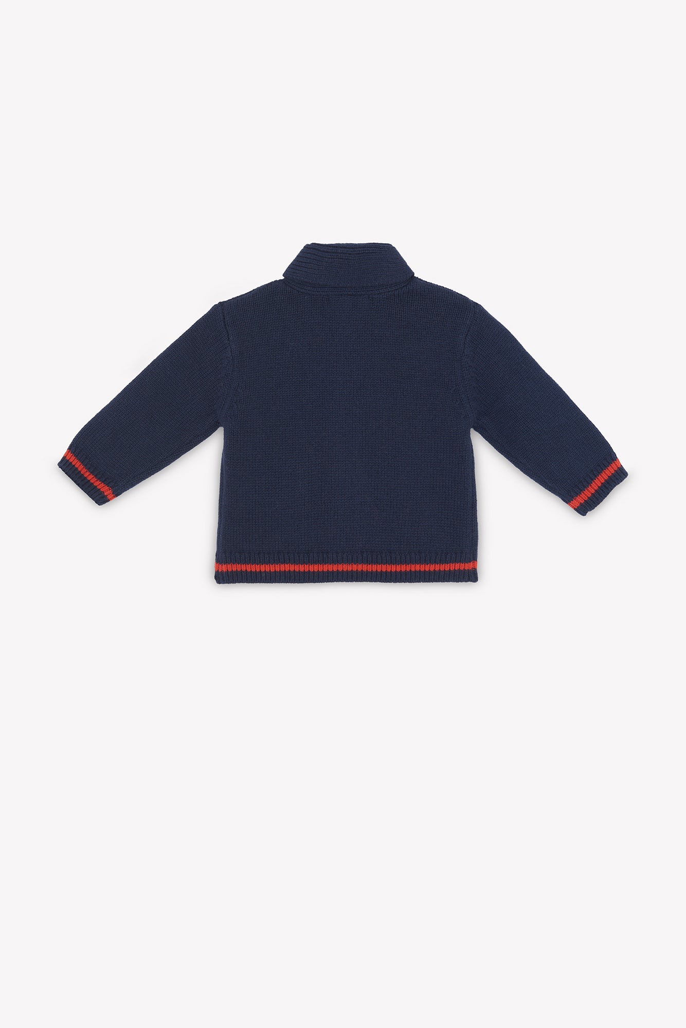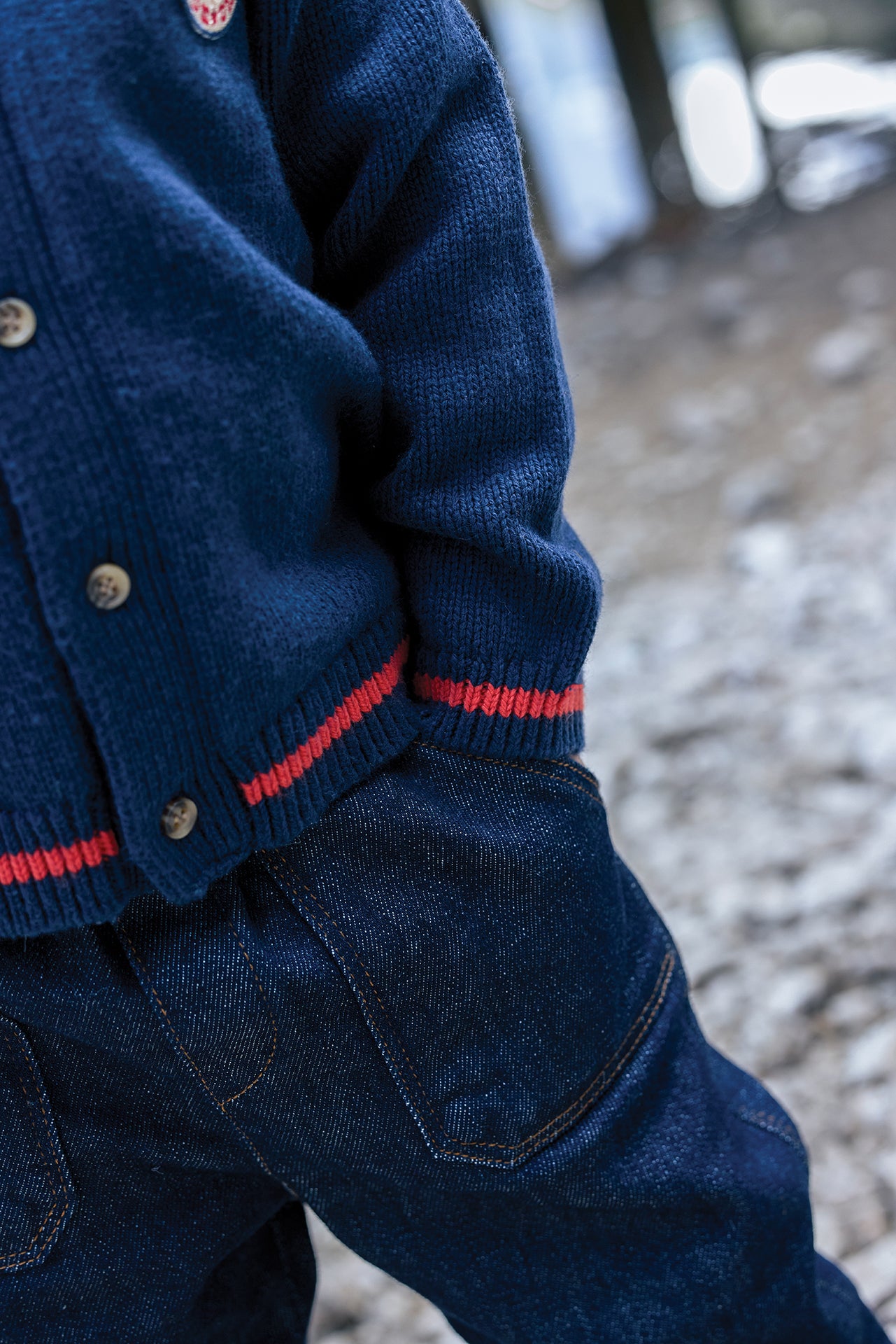 Le cardigan Hubert, en bleu brut, est l'allié parfait des petits cow-boys en herbe ! Inspiré de la collection "New Barn", il invite à l'aventure avec son col châle et son écusson Bonton en forme de montagne. Ce gilet en maille, doux et résistant, se ferme par de jolis boutons, offrant chaleur et style. À associer avec un jean ou un pantalon en velours pour un look western chic et confortable !