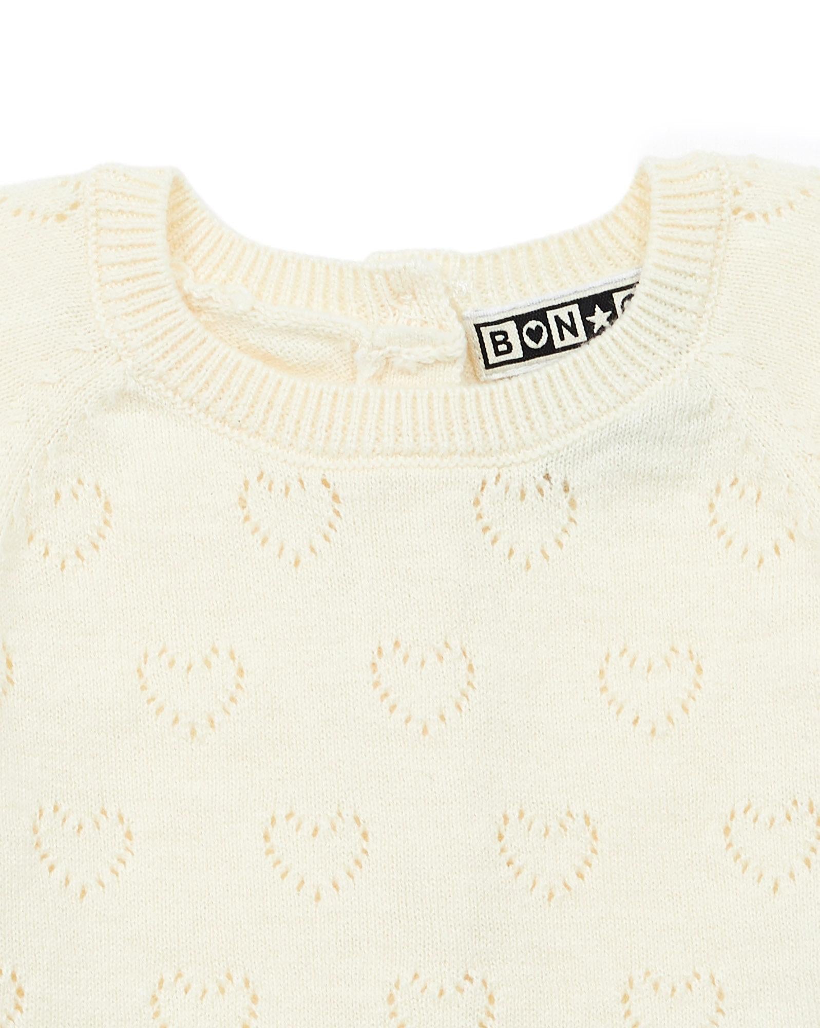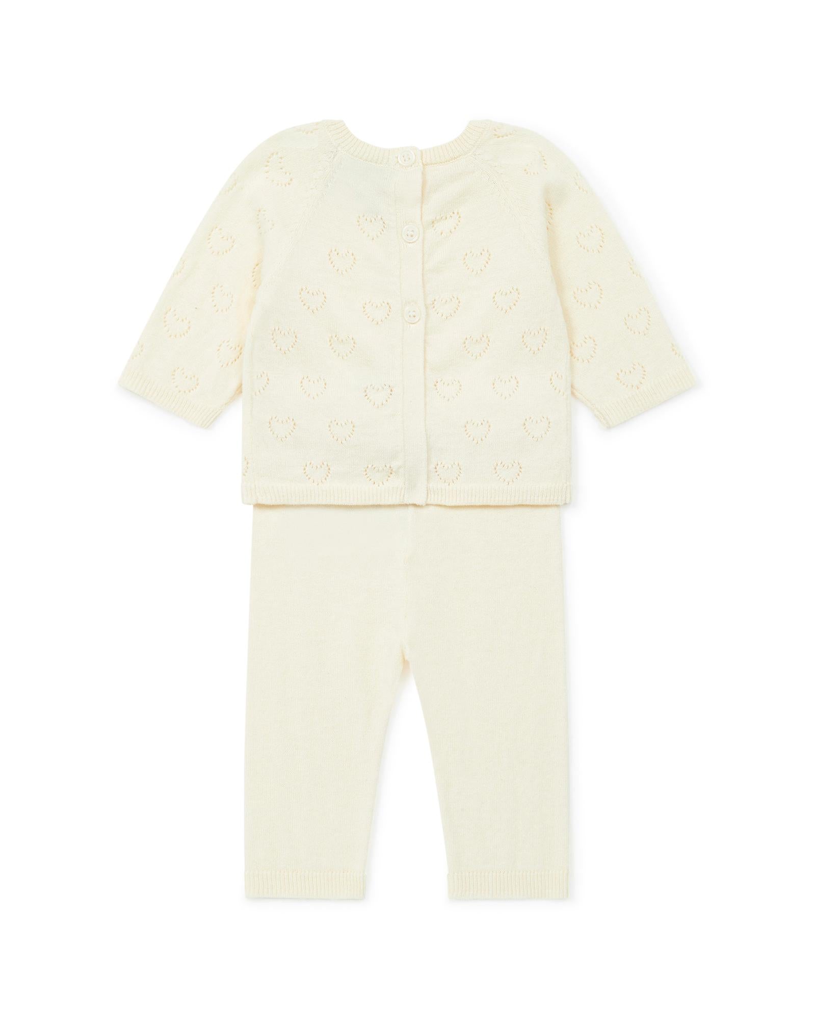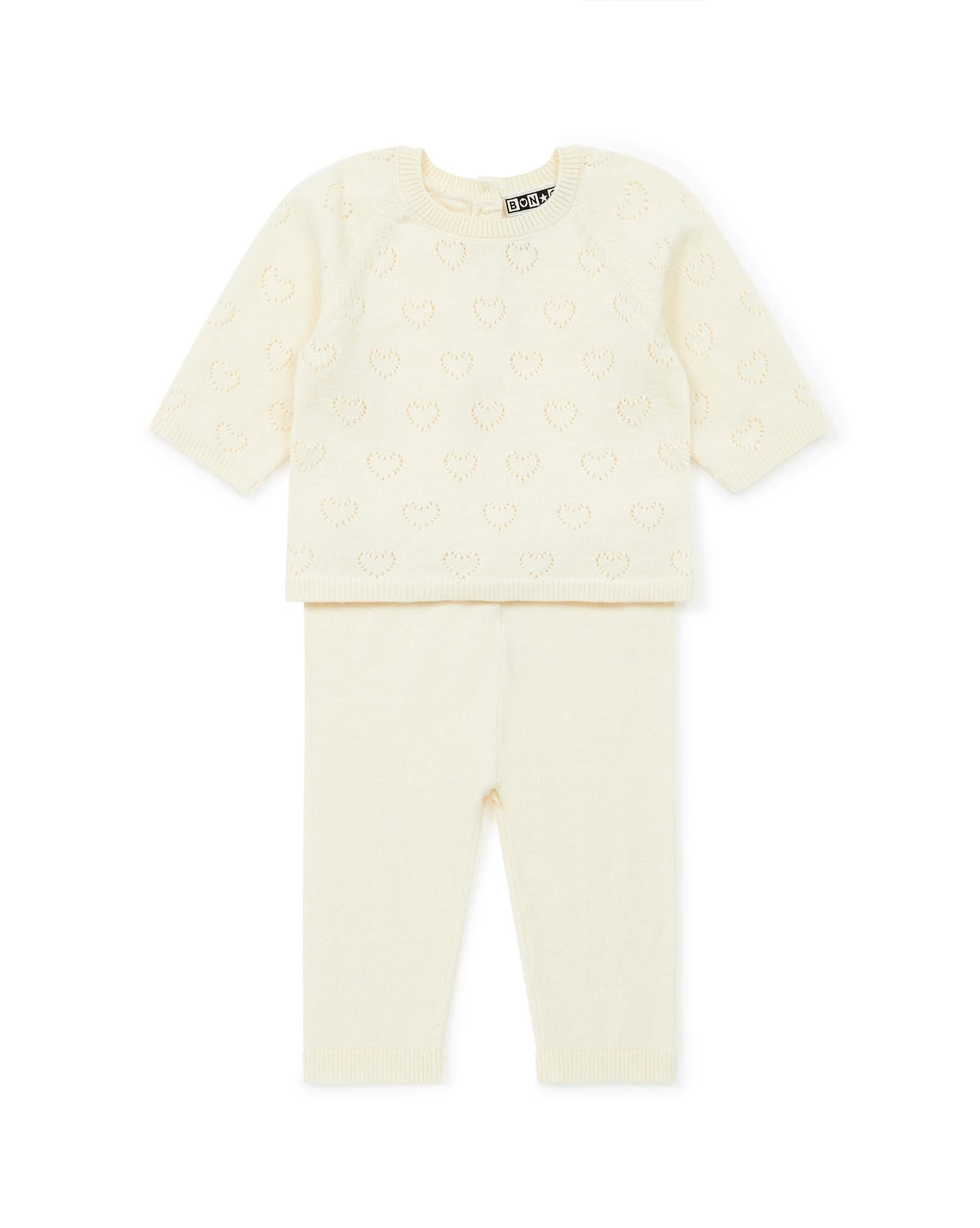 Des gros coeurs pour un ensemble naissance typiquement BONTON avec sa couleur écru bien connue de la Maison. Composé d'un haut à col rond et d'un pantalon à taille élastique en tricot qui sera tout doux pour la peau de bébé.