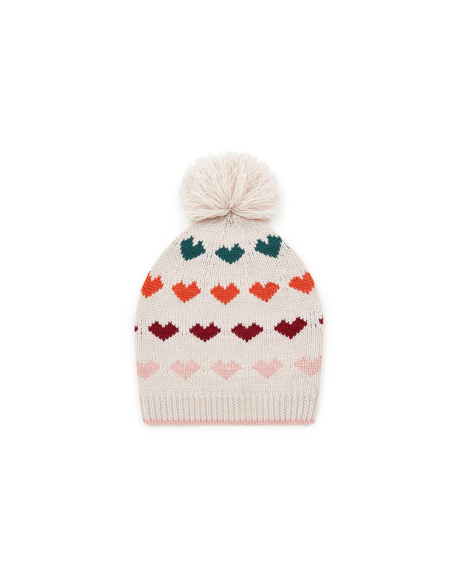 Des coeurs "gros comme ça" ! L'une des plus grandes inspirations de cette saison est le coeur. Ce joli petit bonnet bien douillet tiendra chaud à votre kid ! En tricot jacquard, on craque sur son petit pompon et ses coeurs multicolores, le tout sur fond "Crème Bonton".