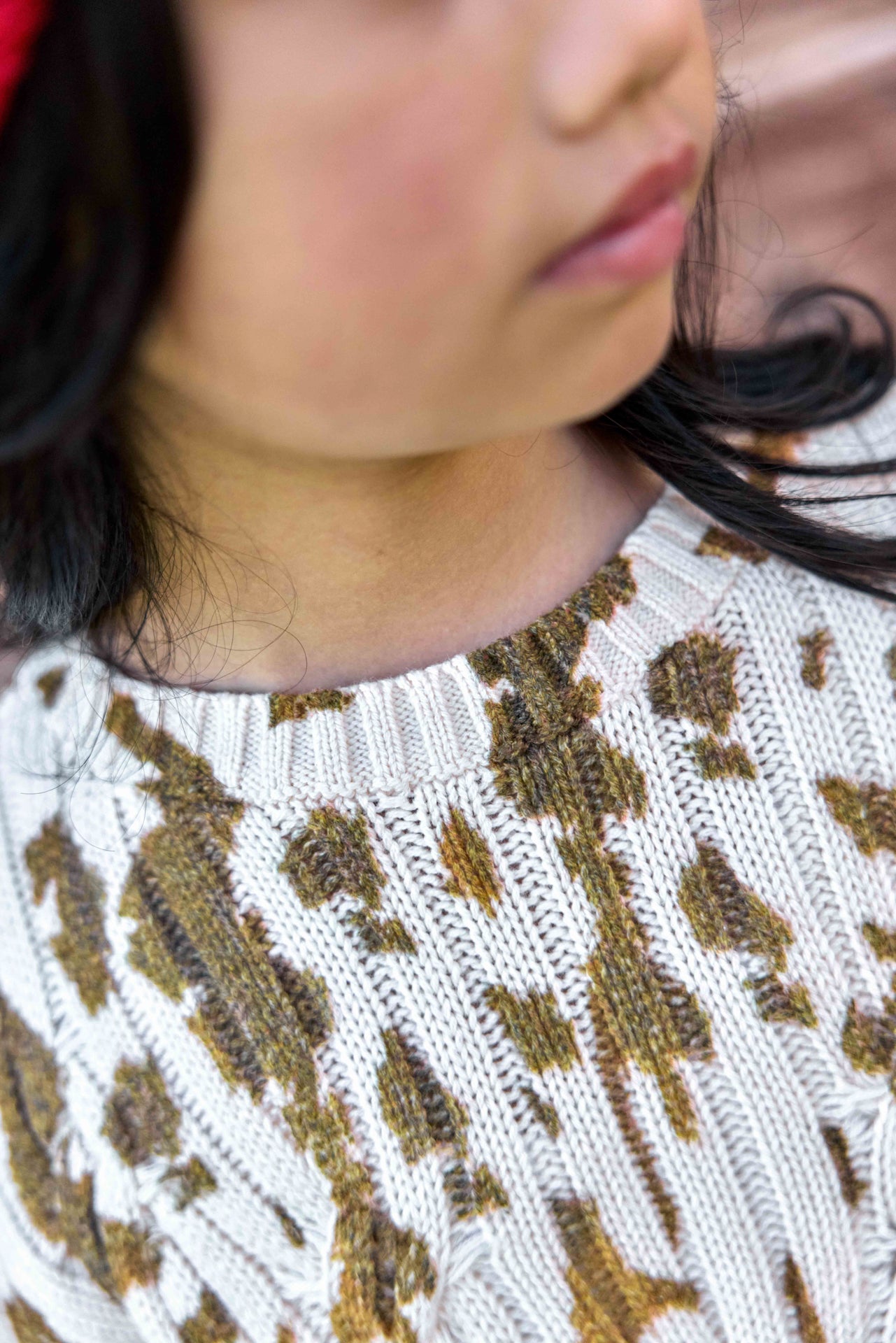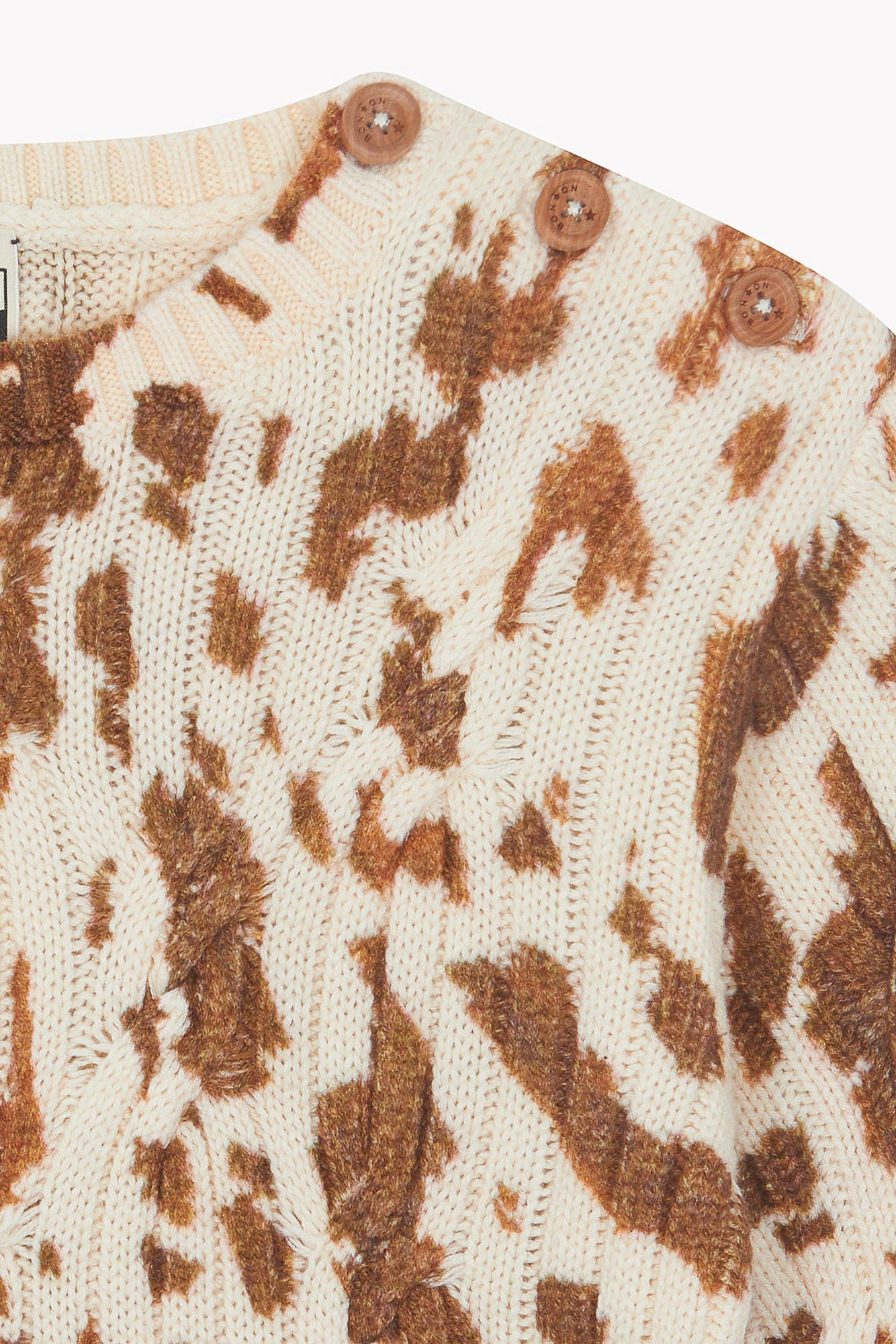 Laissez-vous séduire par le pull Misty Cow, un clin d'œil à l'Ouest américain avec ses motifs tâches et sa maille torsadée. En couleur mouton, il est parfait pour les petites cowgirls en herbe ! Ce pull mélange confort et style, idéal pour les journées fraîches où l'on rêve d'aventure. À porter avec un jean ou une jupe pour un look junior amusant et audacieux.