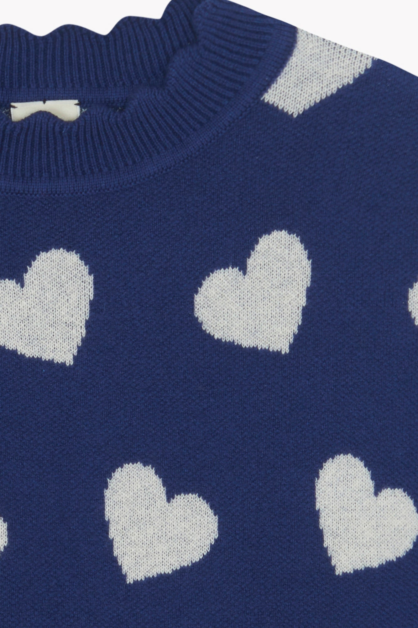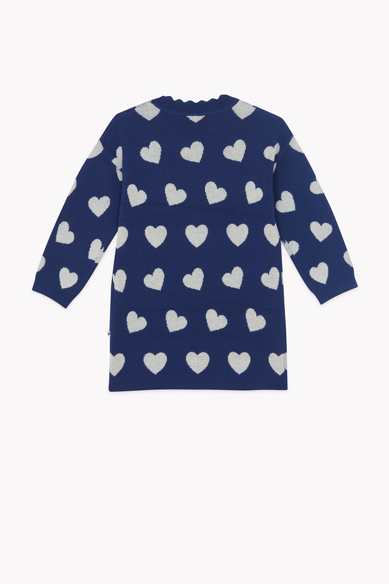 Sublimez les aventures de vos petites cow-girls avec la robe Mila de la collection "New Barn" ! En maille bleu brut, elle est ornée de motifs cœurs blancs qui ajoutent une douce touche d'amour. Le col festonné apporte une note élégante et raffinée, idéale pour virevolter dans les plaines imaginaires. Parfaite avec des bottines ou des sandales !