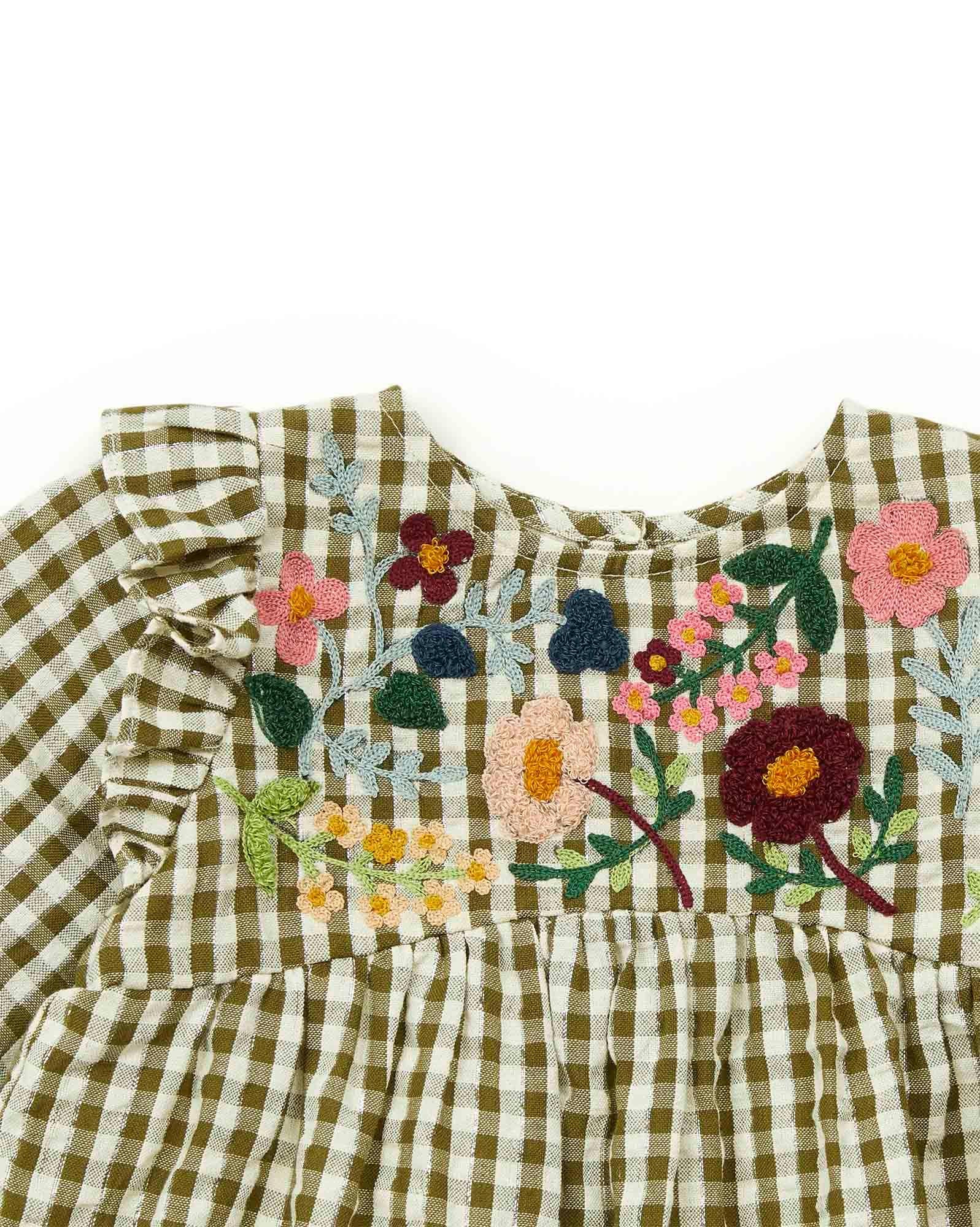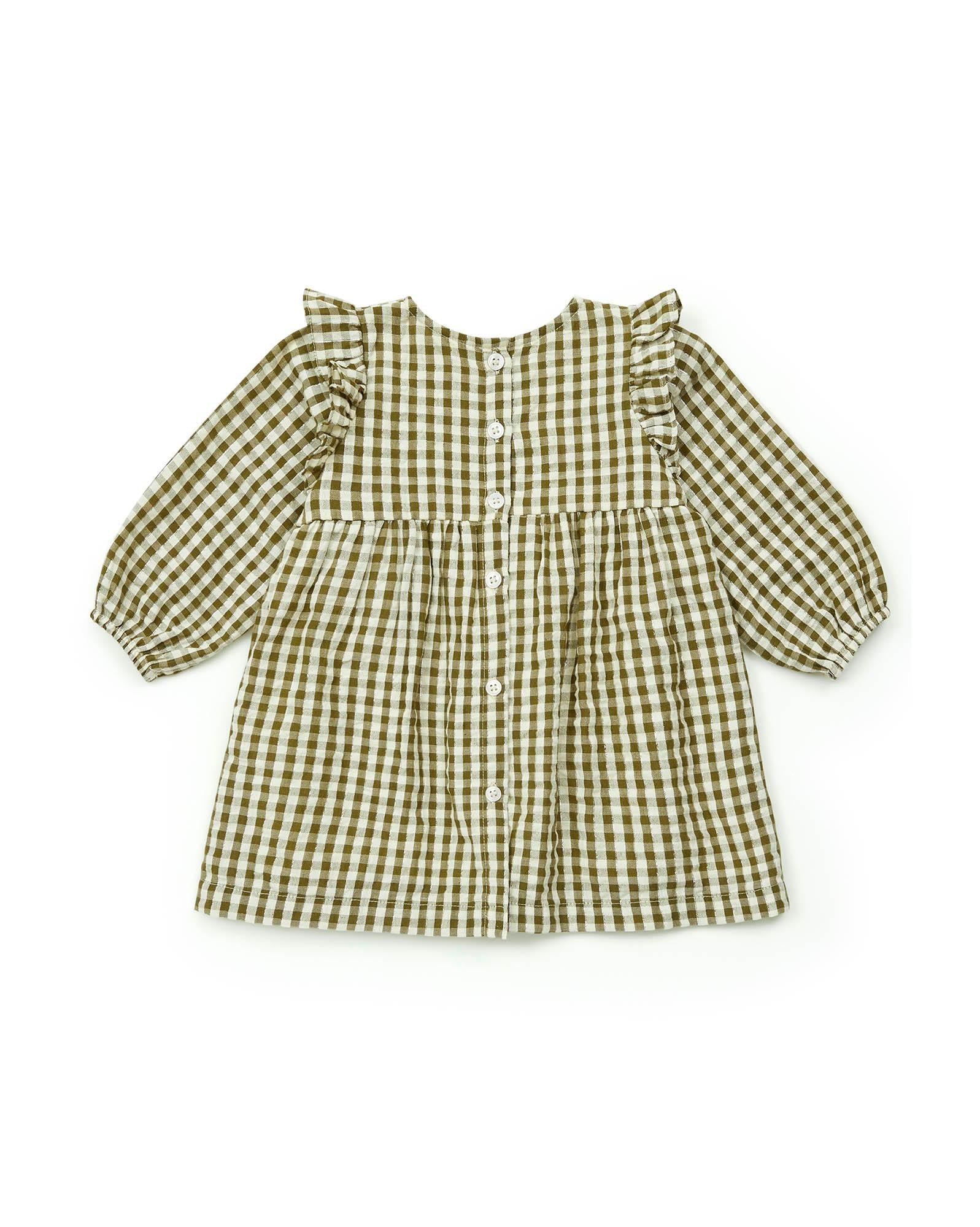 On craque pour cette belle robe en coton qui, aussi élégante que légère, viendra compléter la garde-robe de votre petite bébé. Sa vichy kaki et ses volants apportent perfection à la tenue.