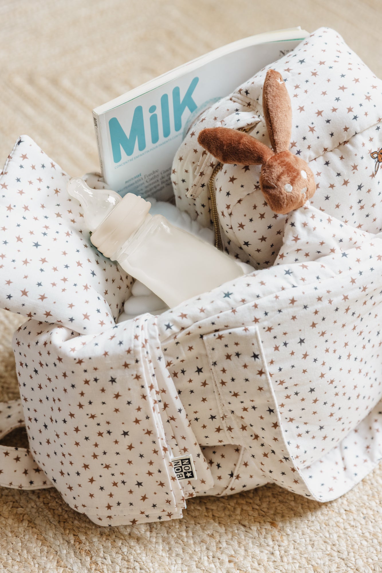 Le sac à langer Baby Star est le compagnon stylé des vadrouilles avec bébé ! 100% coton, léger et pratique, il accueille couches, biberons et doudous avec une facilité déconcertante. Son imprimé étoilé lui donne une touche magique qui fera briller même les sorties du quotidien. Avec lui, on part à l’aventure toujours bien équipés (et avec du style !).