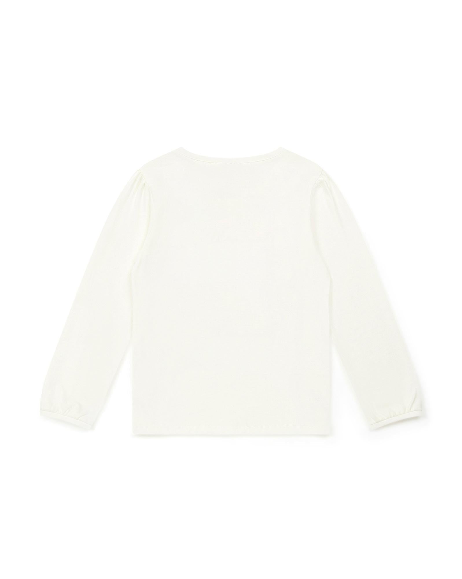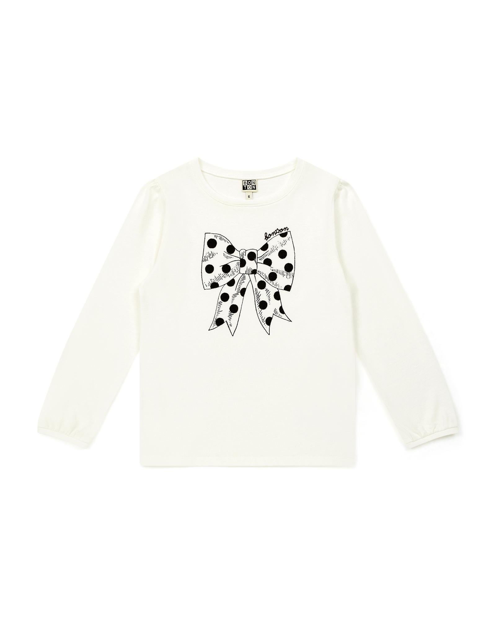Un T-shirt avec en son centre un gros noeud à poids noires. Un design girly aussi doux que son jersey en coton 100% biologique et que sa couleur "Crème Bonton". On aime ses emmanchures raglan volumineuses. Le décor de son design a été dessiné au sein du studio de création BONTON.