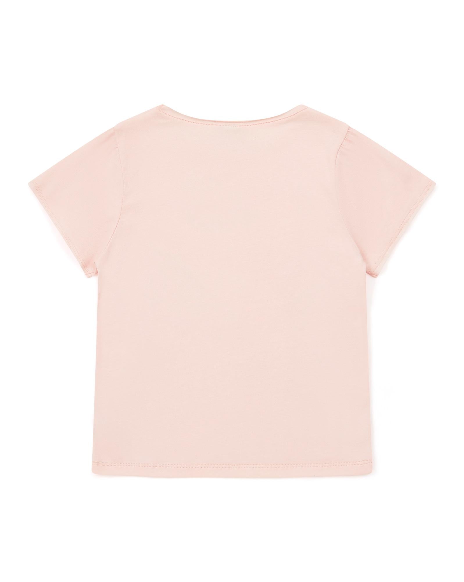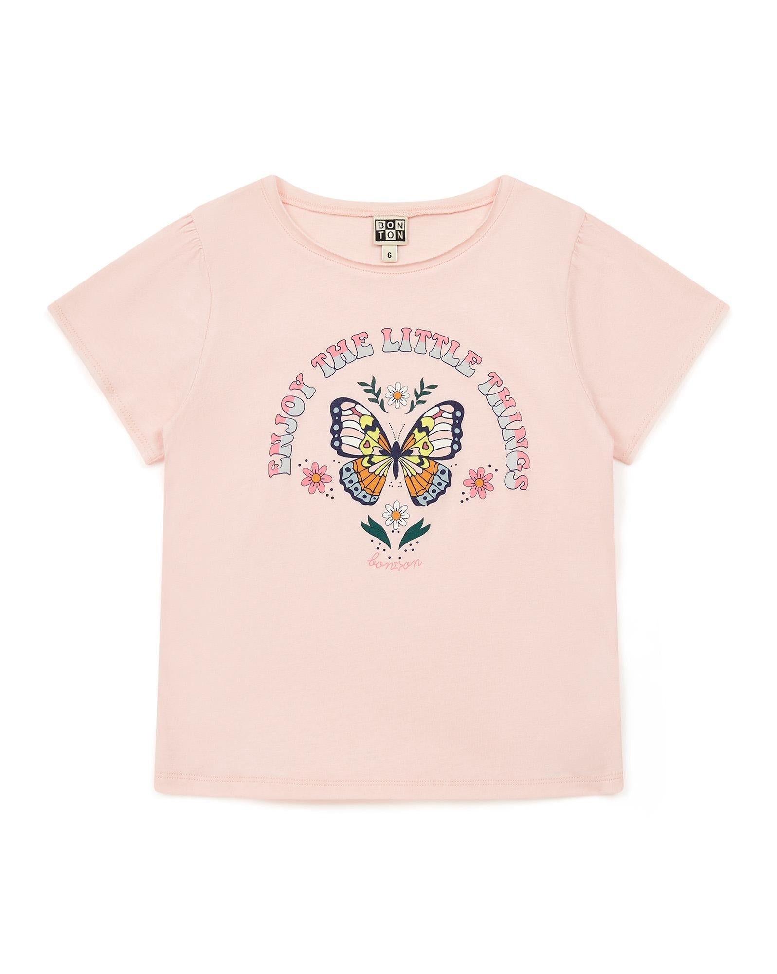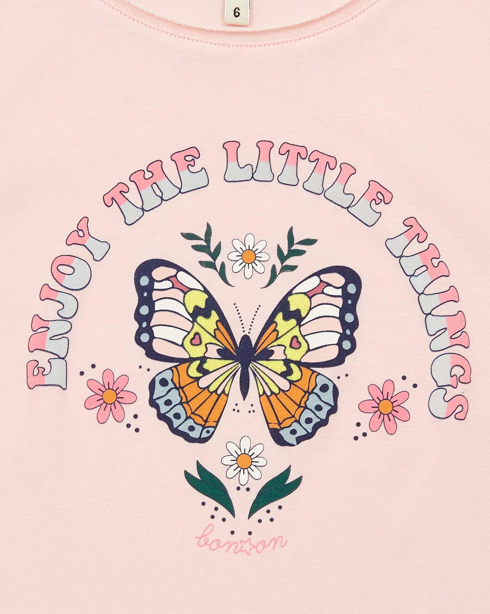 ENJOY THE LITTLE THINGS ! Un message aussi doux que son jersey en coton organique et que sa couleur rose "Anémone". On aime les emmanchures volantées courtes et le travail de broderie. Le décor de son design a été dessiné au sein du studio de création BONTON. L'inspiration s'écrit comme un cabinet de curiosité avec son papillon, on veut de la liberté !